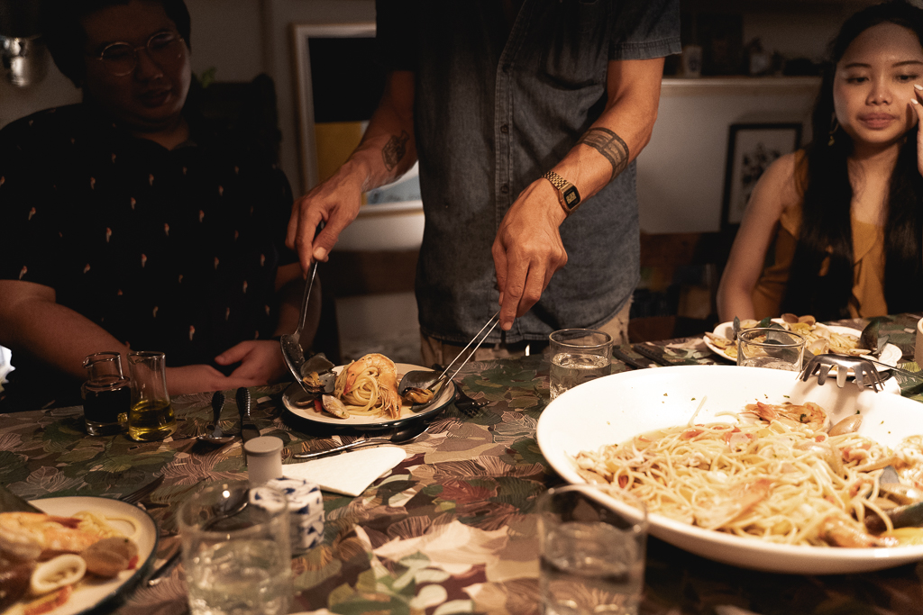 พาสตาจานใหญ่ที่กินกันห้าคนยังไม่หมดและอิ่มจนแน่นท้อง